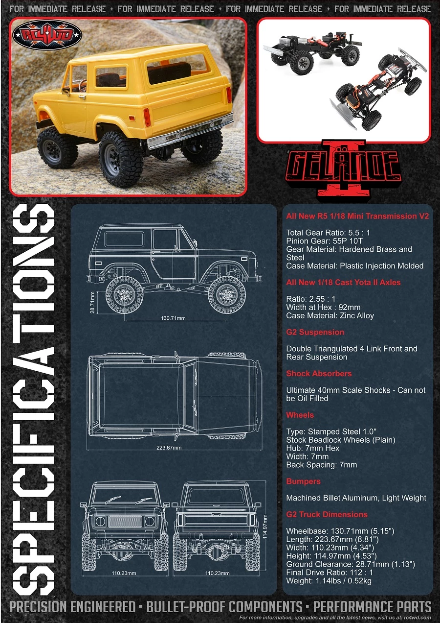 The G2 is built with quality materials and craftsmanship. It can maneuver extreme descents and climbs with ease. The new 1/18 Mini Transmission provides power to the 1/18 Yota II Axles.