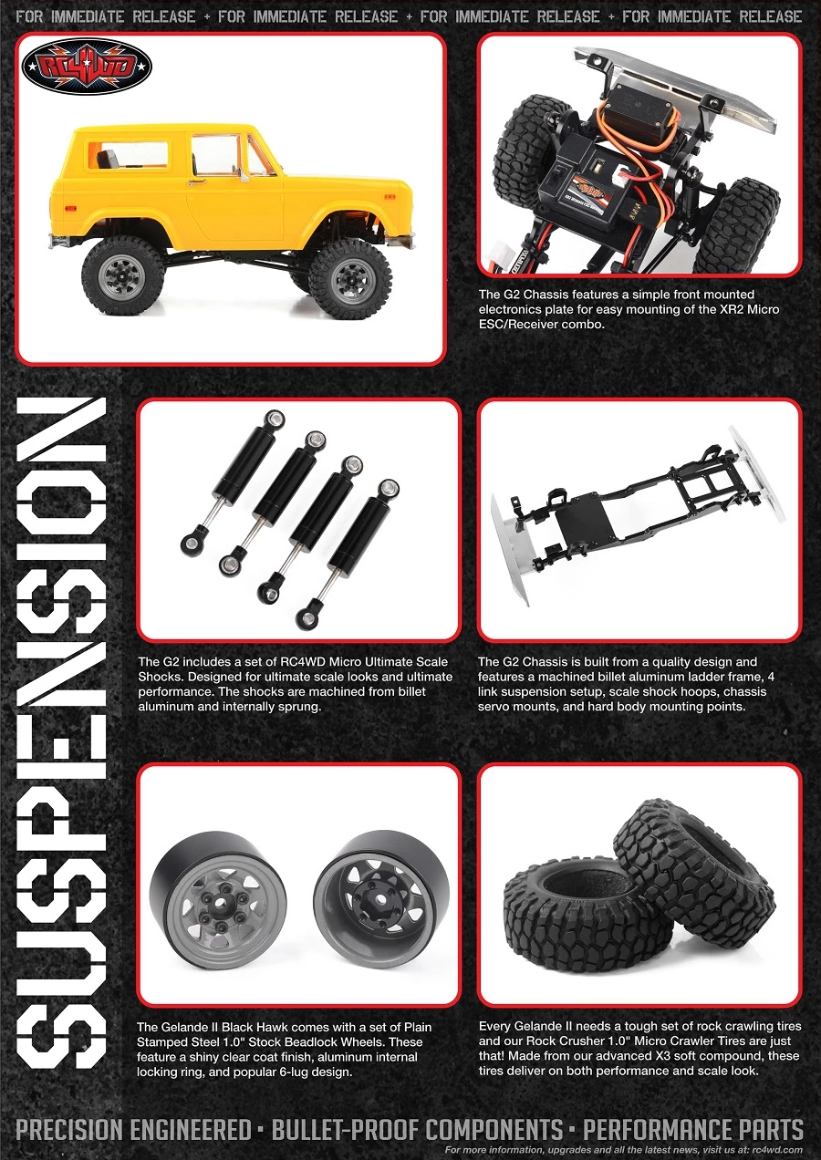 The 1/18 G2 includes a quality 2-in-1 Micro ESC + Receiver paired with the XR2 Micro Radio system and is ready for your next scale adventure