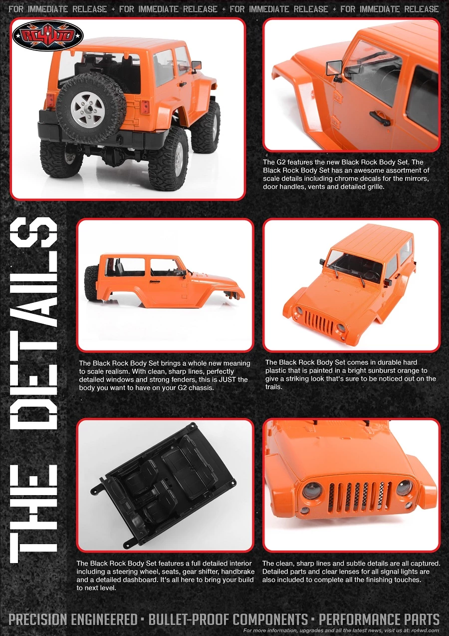 The G2 features the new Black Rock Body Set. The Black Rock Body Set has an awesome assortment of scale details including chrome decals for the mirrors, door handles, vents and detailed grille.