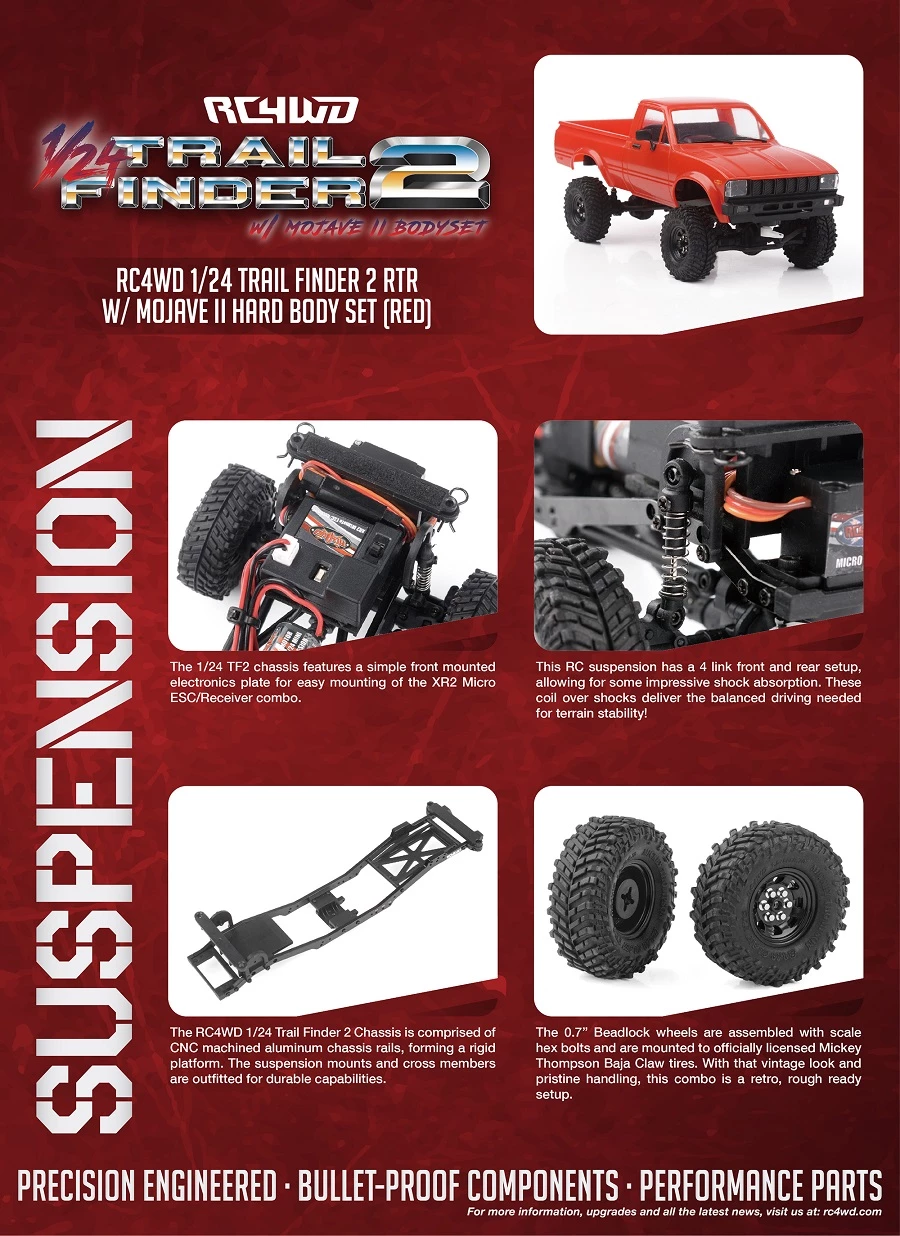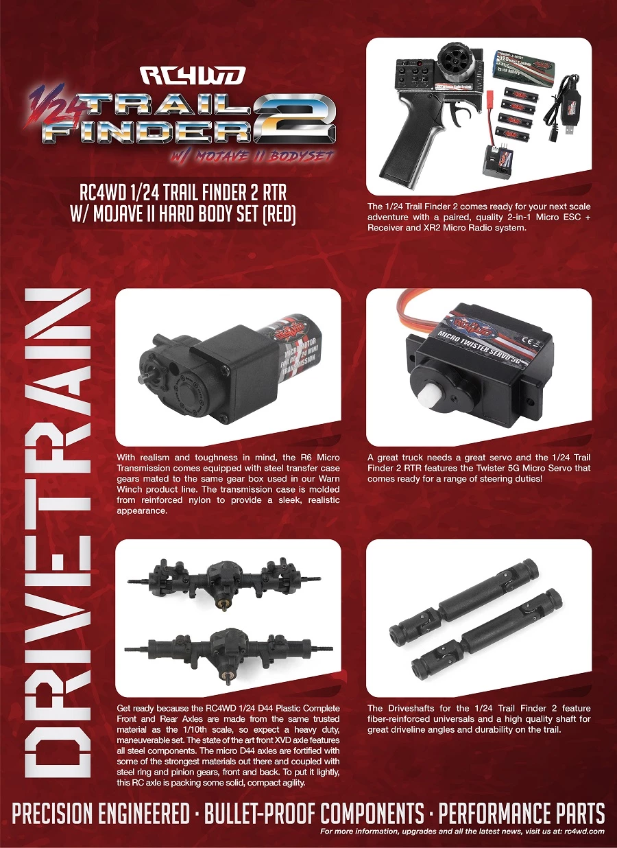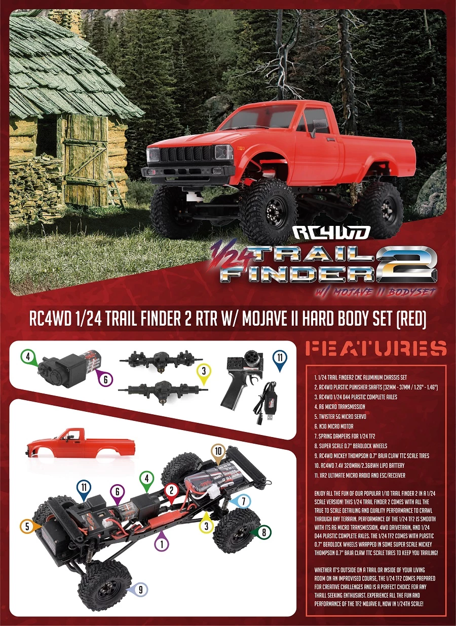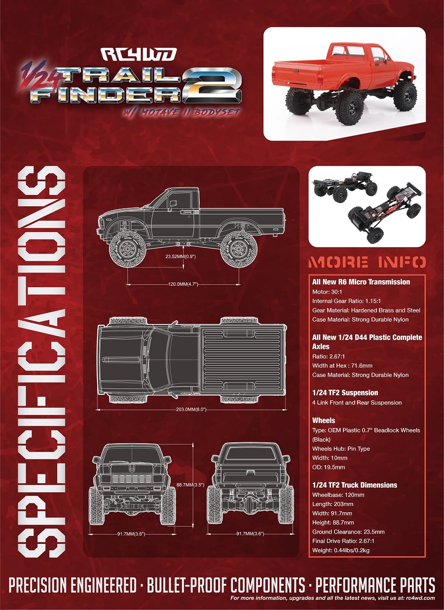 Enjoy all the fun of our popular 1/10 Trail Finder 2 in a 1/24 scale version! This 1/24 Trail Finder 2 comes with all the true to scale detailing and quality performance to crawl through any terrain. Performance of the 1/24 is smooth with its R6 Mini Transmission, 4WD Drivetrain, and 1/24 D44 Scale Axles, the 1/24 TF2 comes with Plastic 0.7″ Beadlock wheels wrapped in some super scale Mickey Thompson 0.7 Baja Claw TTC Scale Tires to keep you trailing!