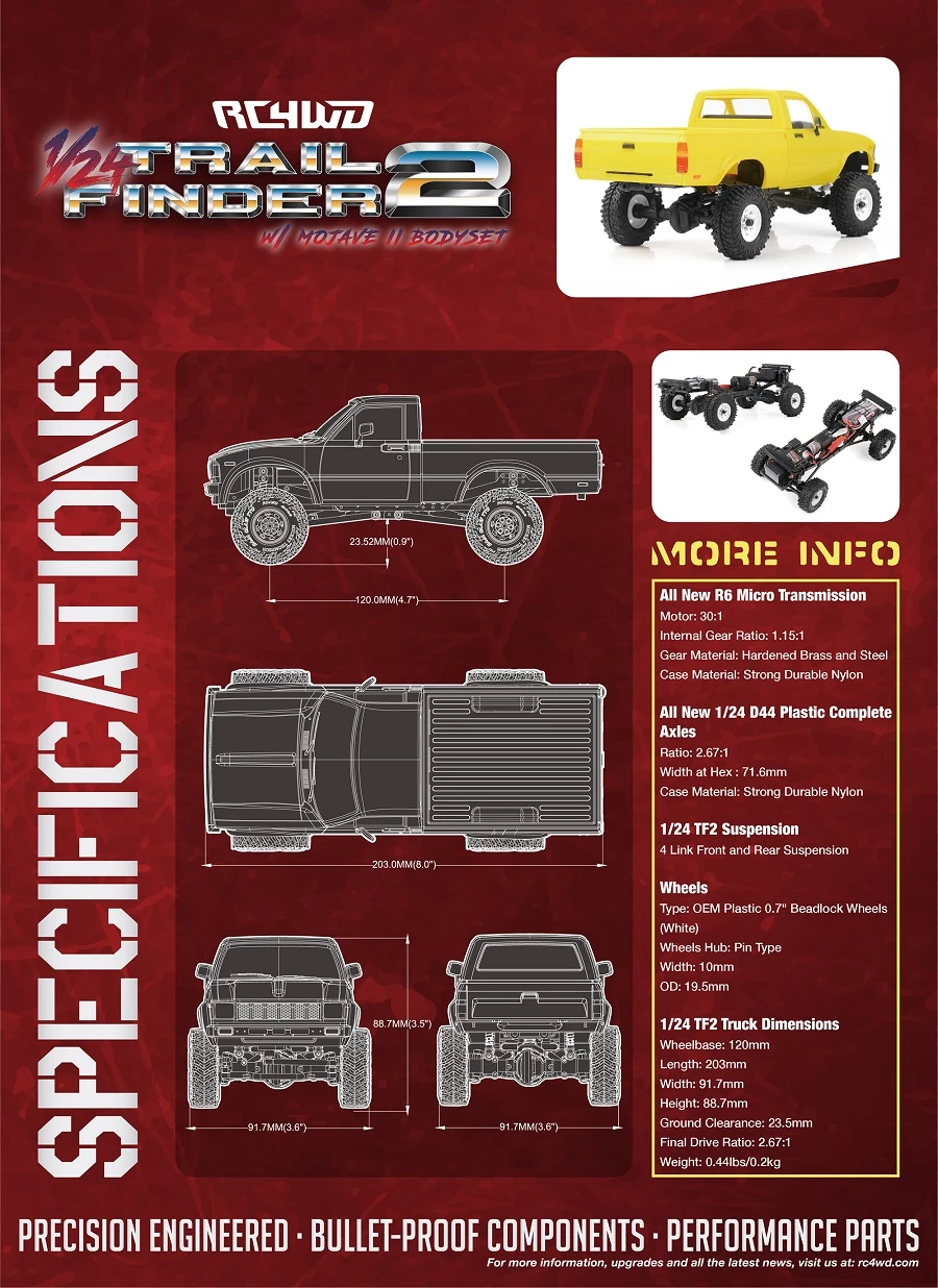 Enjoy all the fun of our popular 1/10 Trail Finder 2 in a 1/24 scale version! This 1/24 Trail Finder 2 comes with all the true to scale detailing and quality performance to crawl through any terrain. Performance of the 1/24 is smooth with its R6 Mini Transmission, 4WD Drivetrain, and 1/24 D44 Scale Axles, the 1/24 TF2 comes with Plastic 0.7″ Beadlock wheels wrapped in some super scale Mickey Thompson 0.7 Baja Claw TTC Scale Tires to keep you trailing!