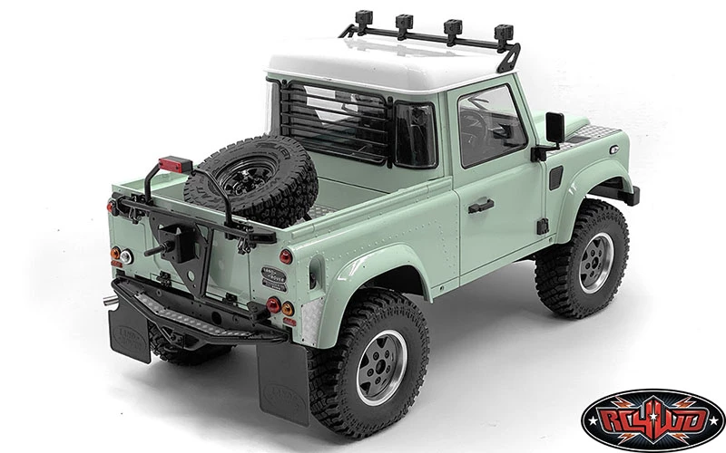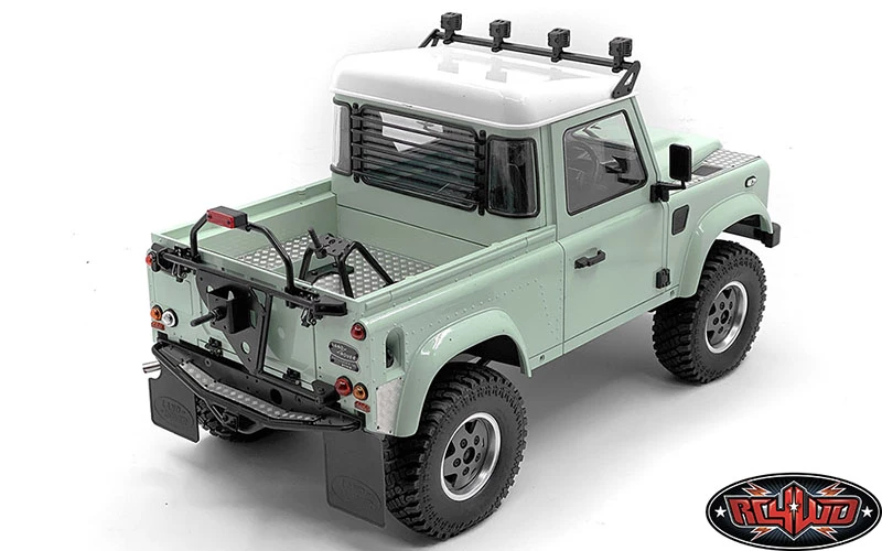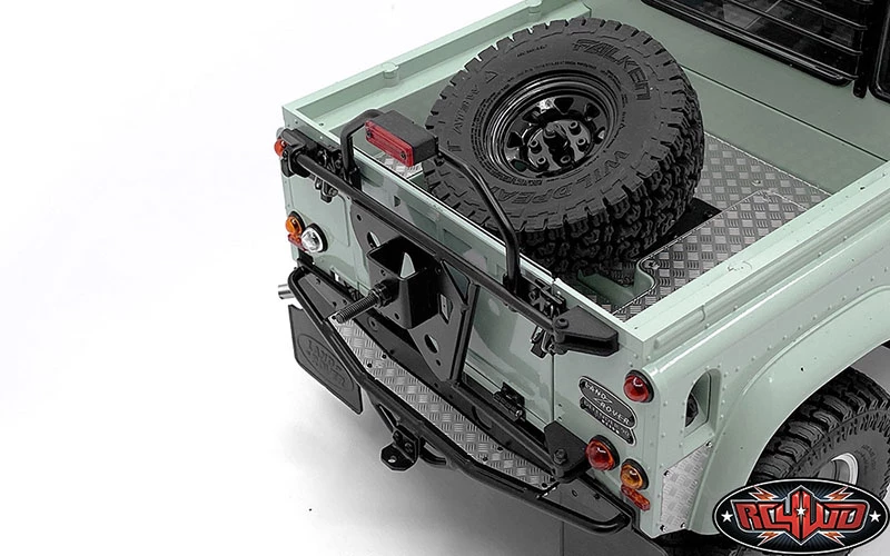 Shown installed on RC4WD Gelande II RTR W/ 2015 Land Rover Defender D90 Body Set (Heritage Edition) (Z-RTR0044) with Steel Front Side Hood Diamond Plates for RC4WD Gelande II 2015 Land Rover Defender D90 (Pick-up/SUV) (VVV-C1085), Steel Roof Light Bar w/ Flood Lights for RC4WD Gelande II 2015 Land Rover Defender D90 (Pick-up/SUV) (VVV-C1093), Steel Rear Window Guard for RC4WD Gelande II 2015 Land Rover Defender D90 (Pick-Up) (VVV-C1094), High Brake Light for RC4WD Gelande II 2015 Land Rover Defender D90 (Pick-Up) (VVV-C1095), Spare Wheel and Tire Holder for RC4WD Gelande II 2015 Land Rover Defender D90 (Pick-up/SUV) (VVV-C1097), Steel Rear Bed Diamond Plates for RC4WD Gelande II 2015 Land Rover Defender D90 (Pick-Up) (VVV-C1086), 5 Lug Wagon 1.9″ Steel Stamped Beadlock Wheels (Black) (Z-W0129), RC4WD Falken Wildpeak A/T Trail 1.9″ Scale Tires (Z-T0195), Rear Tube Bumper for Gelande II (D90/D110) (VVV-C0456), 1/10 Land Rover Defender D90 Emblem Set and Land Rover Emblem for Gelande II D90/D110 Body (Black), Land Rover Mud Flaps for Gelande II D90/D110 (Z-S1888), Dome Spoked 1.9″ Classic Beadlock Wheels (VVV-C0810) and RC4WD Atturo Trail Blade X/T 1.9″ Scale Tires (Z-T0154) for example (Not Included)