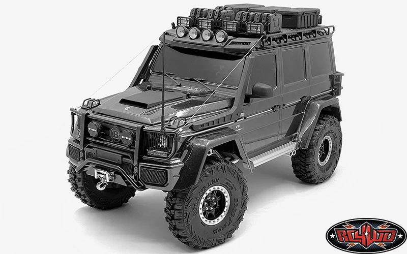 Shown painted black and installed on Traxxas TRX-4 Mercedes-Benz G-500 with the Square Lights of Command Roof Rack w/ Diamond Plate & 4x Square Lights for Traxxas TRX-4 Mercedes-Benz G-500 (VVV-C1000), 1/10 Heavy Duty Cargo Box (VVV-C0936), 1/10 Magnetic Portable Jerry Can Set (VVV-C1008), Boomerang Snorkel for Traxxas Mercedes-Benz G Trucks (VVV-C0915), Emblem Grille for Traxxas TRX-4 Mercedes-Benz G-500 (VVV-C0798), Clarity Roof Light Bar for Mercedes-Benz G 63 AMG 6×6 (VVV-C0918), Tonfa Side Sliders for Traxxas Mercedes-Benz G Trucks (Silver) (VVV-C0974), Command Front Bumper w/ Black Lights for Traxxas Mercedes-Benz G 63 AMG 6×6 (VVV-C0992), Hood Scoop for Mercedes-Benz G 63 AMG 6×6 (VVV-C0916), Round IPF Flood Lights w/ Light Kit for Traxxas Mercedes-Benz G 63 AMG 6×10 (Black) (VVV-C1010), Headlight Guard for Traxxas TRX-4 Mercedes-Benz G-500 (VVV-C0799), Steel Limb Risers for Traxxas Mercedes-Benz G Trucks (VVV-C0997) and Hood Light Guard for Traxxas TRX-4 Mercedes-Benz G-500 (VVV-C0857) for example (Not Included)