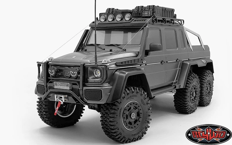 Shown painted black and installed on Traxxas Mercedes-Benz G 63 AMG 6×6 with the Square Lights of Command Roof Rack w/ Diamond Plate & 4x Square Lights for Traxxas Mercedes-Benz G 63 AMG 6×6 (Style B) (VVV-C1004), Boomerang Snorkel for Traxxas Mercedes-Benz G Trucks (VVV-C0915), Clarity Roof Light Bar for Mercedes-Benz G 63 AMG 6×6 (VVV-C0918), Emblem Grille for Mercedes-Benz G 63 AMG 6×6 (VVV-C0919), CB Antenna for Mercedes-Benz G 63 AMG 6×6 (VVV-C0920), Command Bumper w/ Black Lights for Traxxas Mercedes-Benz G 63 AMG 6×6 (VVV-C0922), Air Vent Guards for Traxxas Mercedes-Benz G 63 AMG 6×6 (VVV-C0977), Steel Body Decal Sheet for Traxxas Mercedes-Benz G Trucks (VVV-C0976), Hood Scooop Guard for Traxxas Mercedes-Benz G 63 AMG 6×6 (VVV-C0978), Steel Limb Risers for Traxxas Mercedes-Benz G 63 AMG 6×6 (VVV-C0997), Tonfa Side Sliders for Traxxas Mercedes-Benz G 63 AMG 6×6 (Black) (VVV-C0975), Tarka Drop Bed w/ Tire Holder and Metal Plate for Traxxas Mercedes-Benz G 63 AMG 6×6 (VVV-C0979), RC4WD Mickey Thompson 2.2″ Baja MTZ Scale Tires (Z-T0043), TNK 2.2″ Beadlock Wheels (4x) (VVV-C0986), 1/10 Magnetic Portable Jerry Can Set (VVV-C1008) and 1/10 Heavy Duty Cargo Box (VVV-C0936) for example (Not Included)