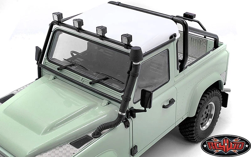 Shown installed on RC4WD Gelande II RTR W/ 2015 Land Rover Defender D90 Body Set (Heritage Edition) (Z-RTR0044) with Steel Front Side Hood Diamond Plates for RC4WD Gelande II 2015 Land Rover Defender D90 (Pick-up/SUV) (VVV-C1085), the Flood Lights of Front Window Roll Cage w/ Flood Lights for RC4WD Gelande II 2015 Land Rover Defender D90 (Pick-Up) (VVV-C1091), Steel Tube Rollbar w/ Flood Lights for RC4WD Gelande II 2015 Land Rover Defender D90 (Pick-Up) (VVV-C1089), Simi Snorkel for Gelande II D90/D110 (VVV-C0913), High Brake Light for RC4WD Gelande II 2015 Land Rover Defender D90 (Pick-Up) (VVV-C1095), Dome Spoked 1.9″ Classic Beadlock Wheels (VVV-C0810) and RC4WD Atturo Trail Blade X/T 1.9″ Scale Tires (Z-T0154) for example (Not Included)