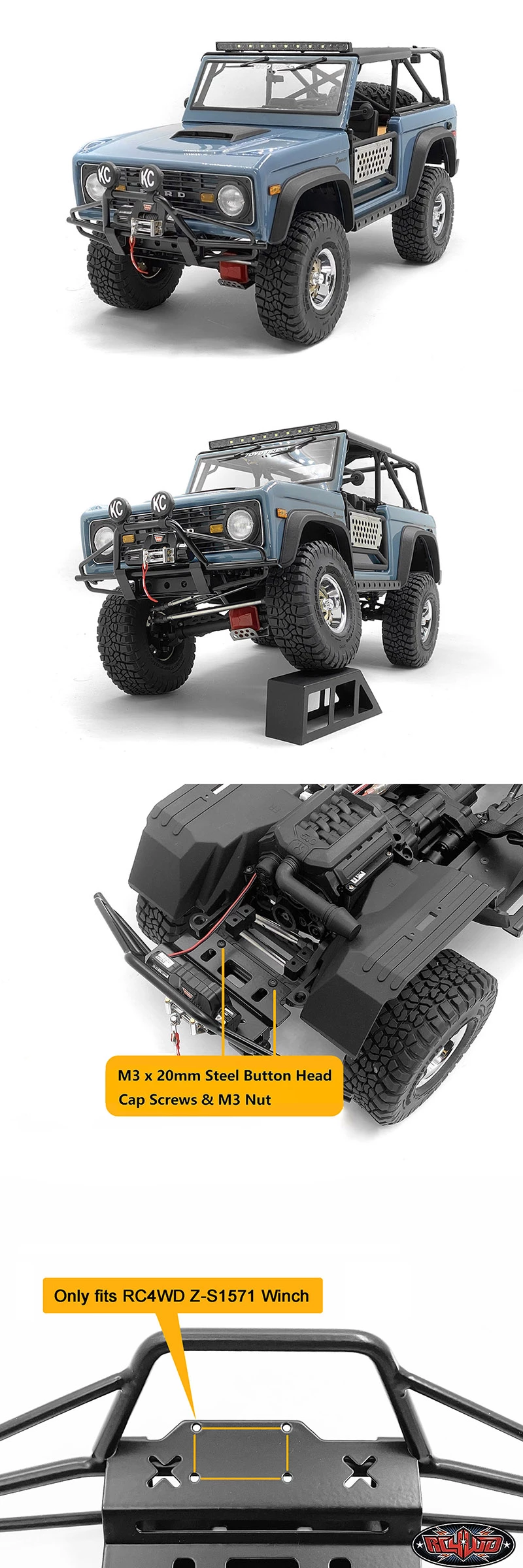 Shown installed on Axial SCX10 III Early Ford Bronco with RC4WD 1/10 Mini Warn 9.5cti Winch (Z-S1571), Side Marker Lights for Axial SCX10 III Early Ford Bronco (VVV-C1278), Hood Scoop for Axial SCX10 III Early Ford Bronco (Black) (VVV-C1271), Metal Roof Panel for Axial SCX10 III Early Ford Bronco (VVV-C1290), Rear Tube Cage for Axial SCX10 III Early Ford Bronco (VVV-C1282), Tube Front Doors for Axial SCX10 III Early Ford Bronco (VVV-C1283), Side Metal Emblem for Axial SCX10 III Early Ford Bronco (Silver) (VVV-C1268), Front Light Bar for Axial SCX10 III Early Ford Bronco (VVV-C1285) and Black Offroad Obstacle for example (Not Included)