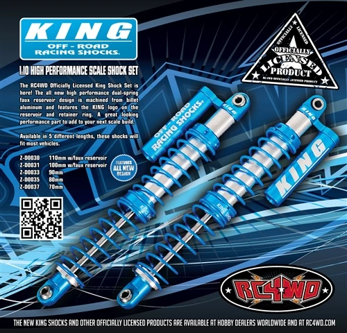 Licensed from King Offroad shocks. These new shocks feature a complete new design from the ground up and are built and ready to handle the rocks. Your scale build will never be the same once you bolt up a set of these awesome looking shocks.