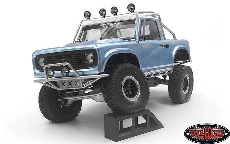 Shown installed on Vanquish VS4-10 Pro Rock Crawler Kit w/ Origin Half Cab Body with Tri-X Steel Stinger Front Bumper w/ Lights for Vanquish VS4-10 Origin Body (Silver) (VVV-C0943), Exterior Steel Roll Cage w/ Lights for Vanquish VS4-10 Origin Halfcab Body (Silver) (VVV-C0967), Steel Tube Roll Bar for Vanquish VS4-10 Origin Halfcab Body (Silver) (VVV-C0969) and Black Offroad Obstacle for example (Not Included)