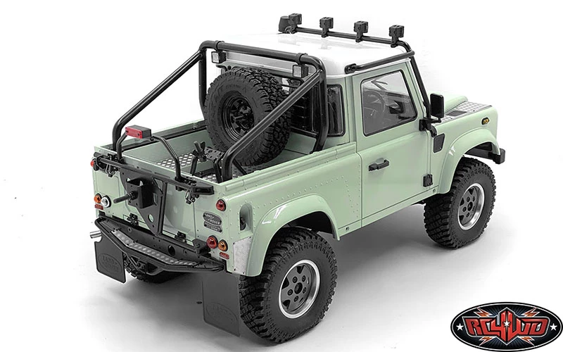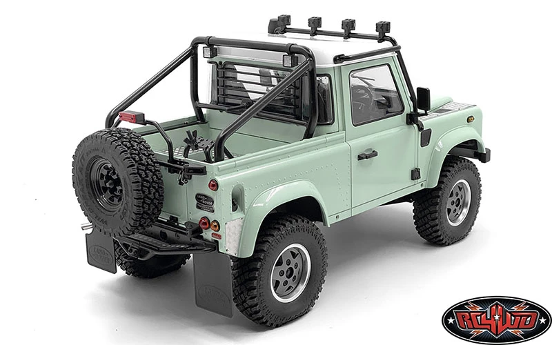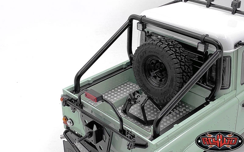 Shown installed on RC4WD Gelande II RTR W/ 2015 Land Rover Defender D90 Body Set (Heritage Edition) (Z-RTR0044) with Steel Front Side Hood Diamond Plates for RC4WD Gelande II 2015 Land Rover Defender D90 (Pick-up/SUV) (VVV-C1085), Front Window Roll Cage w/ Flood Lights for RC4WD Gelande II 2015 Land Rover Defender D90 (Pick-Up) (VVV-C1091), Steel Rear Window Guard for RC4WD Gelande II 2015 Land Rover Defender D90 (Pick-Up) (VVV-C1094), High Brake Light for RC4WD Gelande II 2015 Land Rover Defender D90 (Pick-Up) (VVV-C1095), Bed Mounted Spare Wheel and Tire Holder for RC4WD Gelande II 2015 Land Rover Defender D90 (Pick-Up) (VVV-C1096), Spare Wheel and Tire Holder for RC4WD Gelande II 2015 Land Rover Defender D90 (Pick-up/SUV) (VVV-C1097), the Flood Lights of Steel Tube Rollbar w/ Flood Lights for RC4WD Gelande II 2015 Land Rover Defender D90 (Pick-Up) (VVV-C1089), 5 Lug Wagon 1.9″ Steel Stamped Beadlock Wheels (Black) (Z-W0129), RC4WD Falken Wildpeak A/T Trail 1.9″ Scale Tires (Z-T0195), Rear Tube Bumper for Gelande II (D90/D110) (VVV-C0456), 1/10 Land Rover Defender D90 Emblem Set and Land Rover Emblem for Gelande II D90/D110 Body (Black), Land Rover Mud Flaps for Gelande II D90/D110 (Z-S1888), Dome Spoked 1.9″ Classic Beadlock Wheels (VVV-C0810) and RC4WD Atturo Trail Blade X/T 1.9″ Scale Tires (Z-T0154) for example (Not Included)