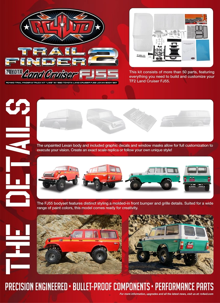 The RC4WD Trail Finder 2 Truck Kit LWB W/ 1980 Toyota Land Cruiser FJ55 Lexan Body Set is an all-new customizable canvas for RC enthusiasts and scale artists alike. This FJ55 Lexan body set replicates the stocky look of the ‘Iron Pig’ and comes molded from quality material. Notice the precise positioning of the circular headlights with bezels and the tapering hood to a compact grill, recreating that distinctive front-end face. Finish it off with a Lexan body designed for any chosen paint job, from a single color to a signature two-tone!
