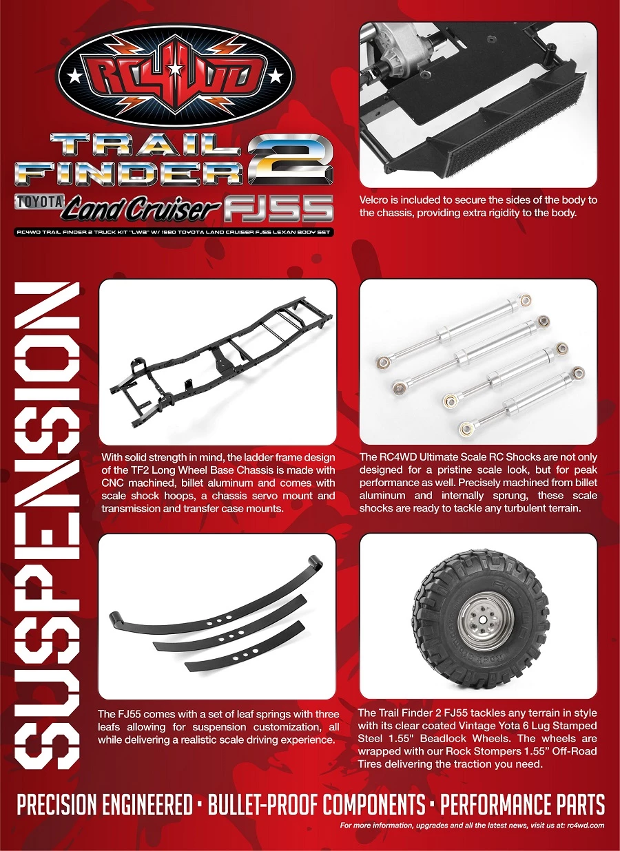 The FJ55 comes with a set of leaf springs with three leafs allowing for suspension customization, all while delivering a realistic scale driving experience.