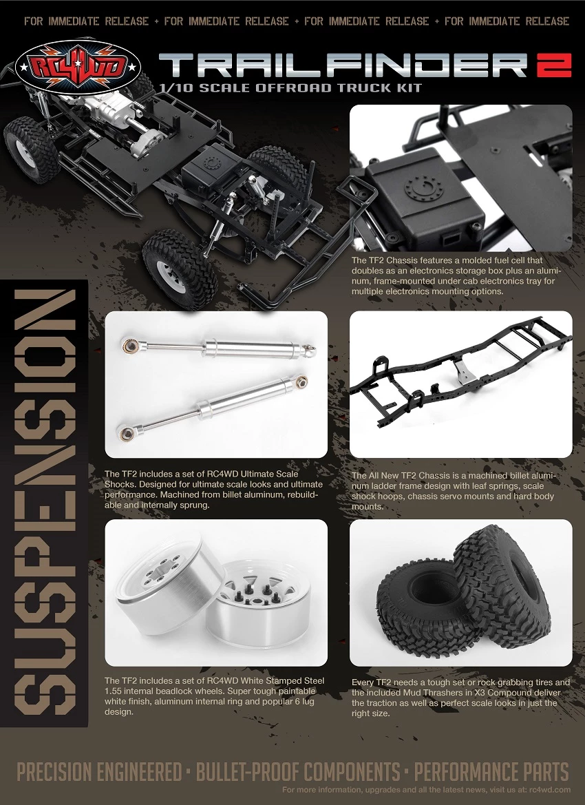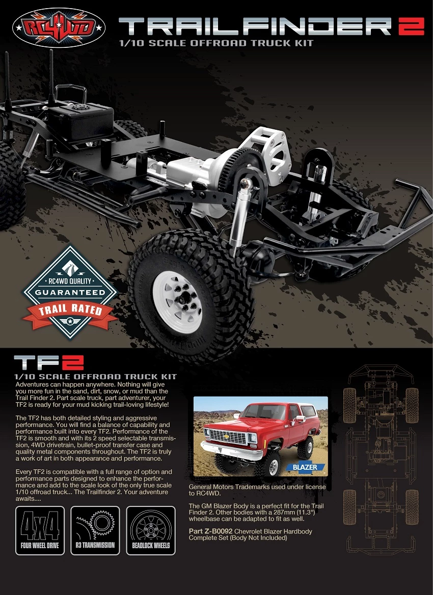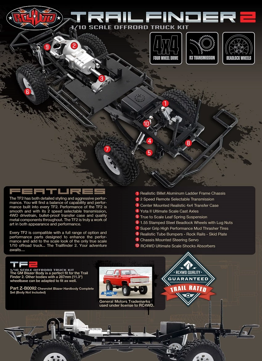Every TF2 is compatible with a full range of option and performance parts designed to enhance the performance and add to the scale look of the only true scale 1/10 offroad truck… The Trailfinder 2. Your adventure awaits….