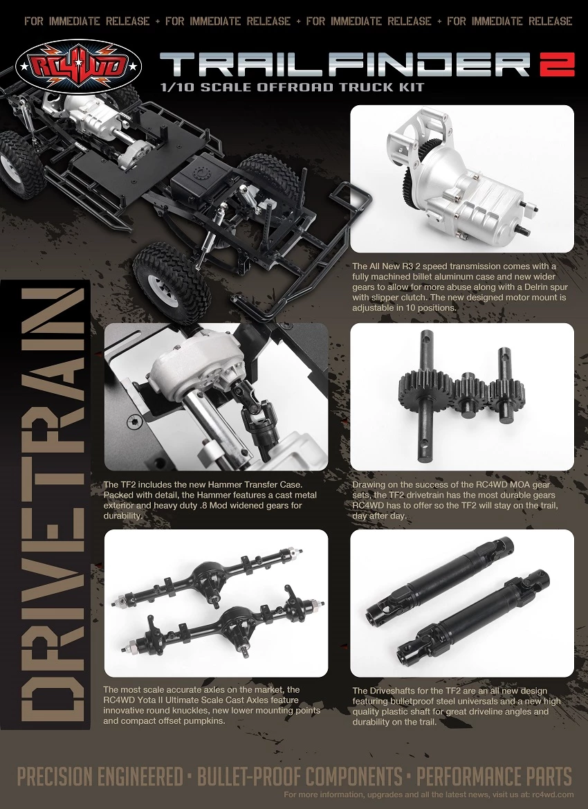 Drawing on the success of the RC4WD MOA gear sets, the TF2 drivetrain has the most durable gears RC4WD has to offer so the TF2 will stay on the trail, day after day.