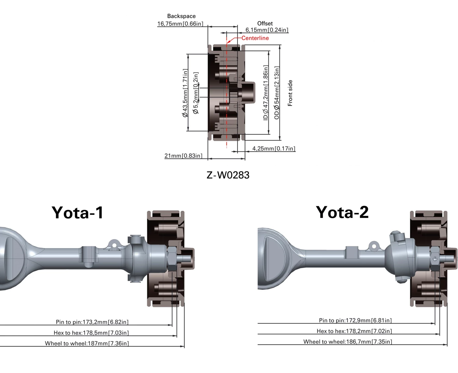 Wheel is designed to fit on Yota 1 and Yota 2 axles and will narrow the offset 6.15mm.
