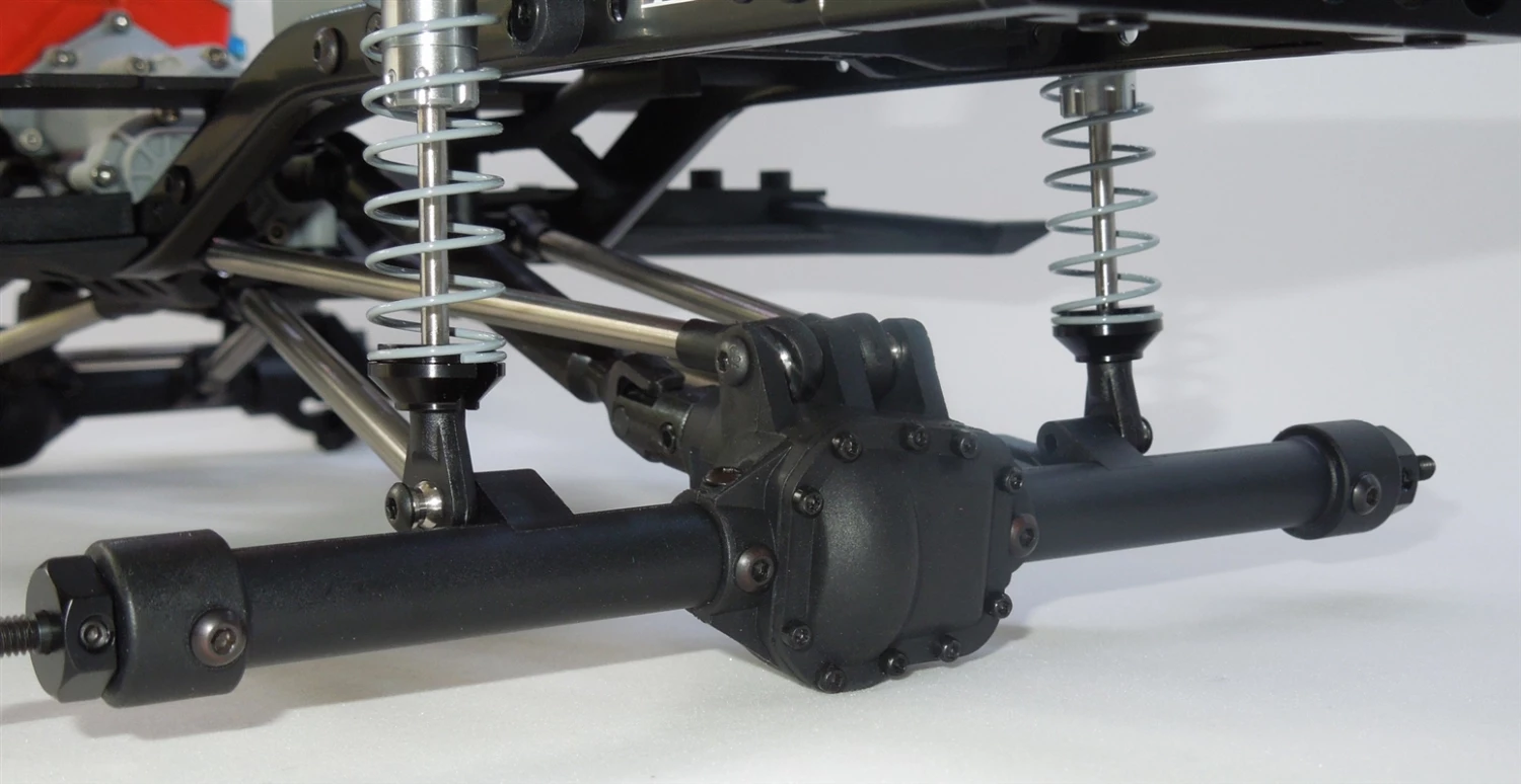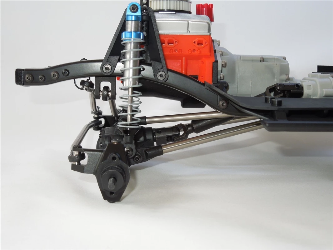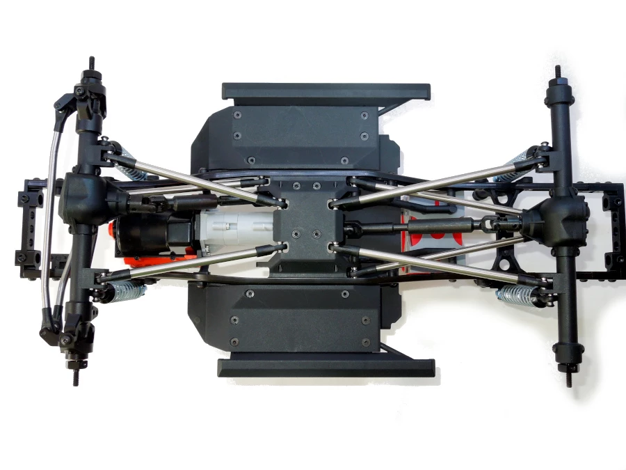 Chassis mounted servo with scale axle design. Machined aluminum chassis panhard mount.