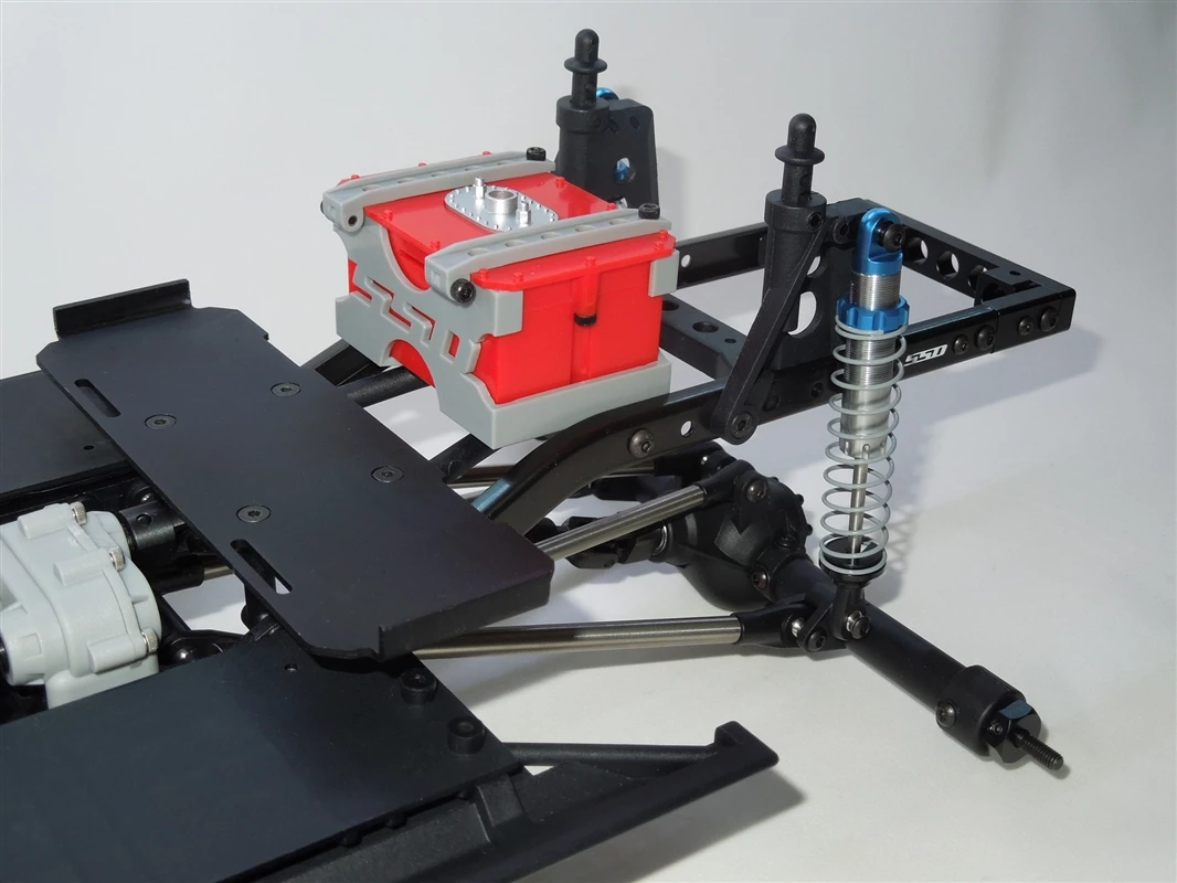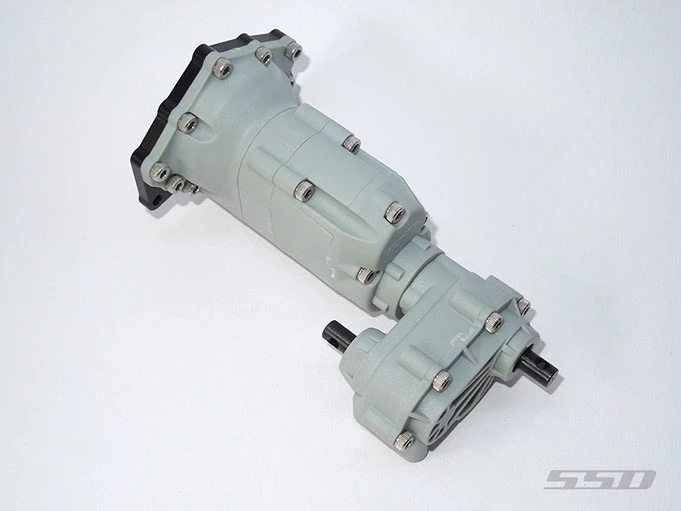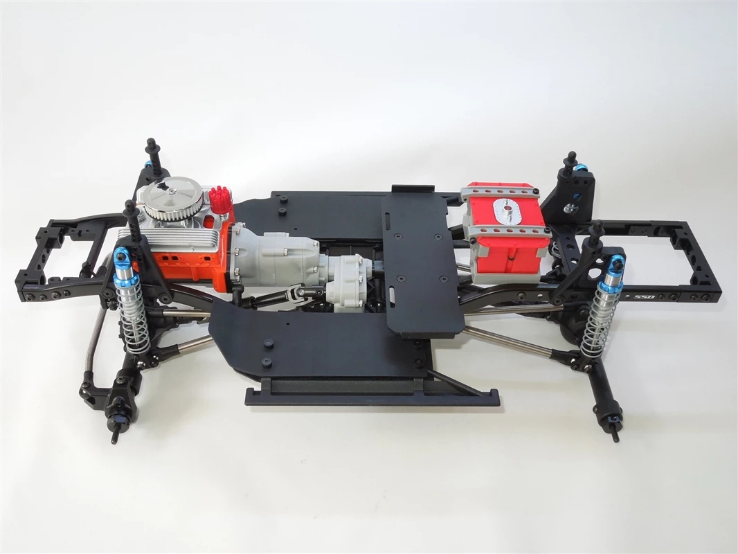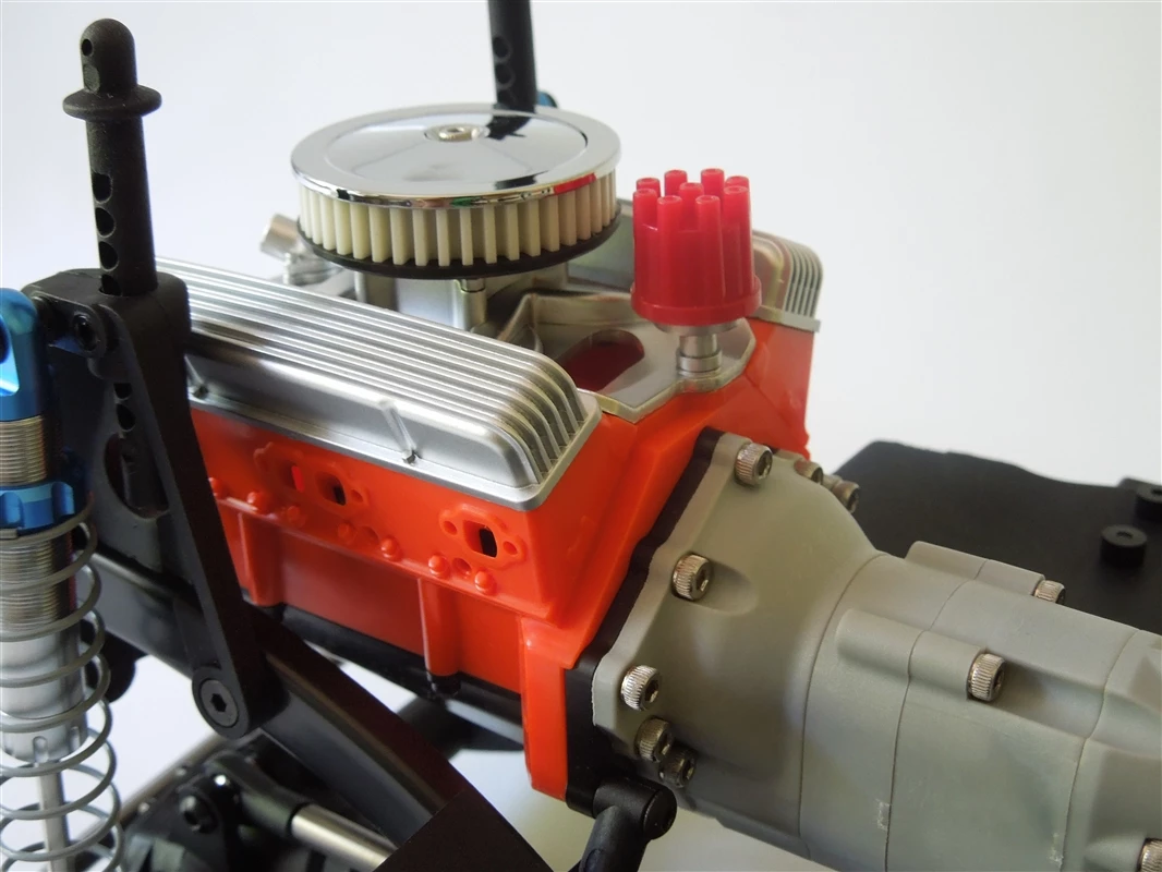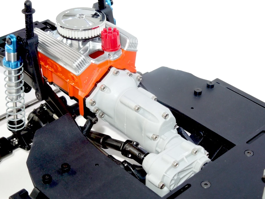 Scale transmission with aluminum motor mount and all machined steel gears. Included scale V8 engine motor cover.