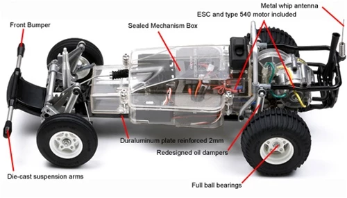 Chassis features a 2mm thick FRP plate with an aluminum reinforcing plate for strength and flexibility to ensure stability. 4-wheel independent suspension features front double trailing arm and rear swing axle setups, die-cast suspension arms, and oil dampers. Electronics and battery are protected by a durable clear plastic mechanism box. Comes equipped with full ball bearings to reduce friction loss, and mounted on the 3-piece center-lock wheels are grooved front tires and ribbed rear tires that ensure superb off-road performance.