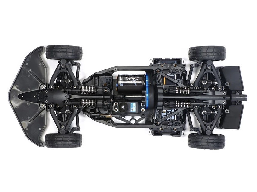This durable composite monocoque-frame chassis provides shaft driven 4WD from a central motor via front and rear propeller shafts, with oil filled gear differentials. 4-wheel independent double wishbone suspension employs long arms, plus inboard setups front and rear with oil shock-dampers actuated by push rods and rocker arms to allow the use of low-profile bodies. Adjust spacer width to easily alter camber, skid and toe angle settings. Both suspension arms and uprights are identical left, right, front and rear, for more efficient maintenance and pit work.