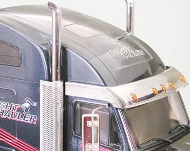 This 1/14 scale R/C Tractor Trucks Item features an originally designed truck body. Hood, large roof spoiler, interior, and lights (clear orange parts), which have been artistically rendered in exquisite detail. Grill, tank, exhaust and steps have been beautifully rendered with metal plated parts. Kit includes stickers and 540 motor. 7.2V battery pack and R/C system are sold separately.