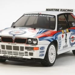 This is a 1/10 R/C model assembly kit of the Lancia Delta Integrale. The polycarbonate body recreates the look of the angular 4-door hatchback, complete with front/rear blister fenders and down to details such as the bulge on the front bonnet and the numerous air intakes in the front bumper. The kit also includes separate parts to depict the side mirrors and roof spoiler. Stickers recreate the markings, including the famous Martini Racing stripes. The model runs on the front motor, belt-driven 4WD XV-01 chassis, and comes complete with rally block tires to make it ready to drive on-road or on flat dirt.