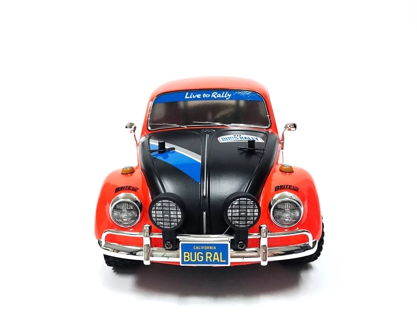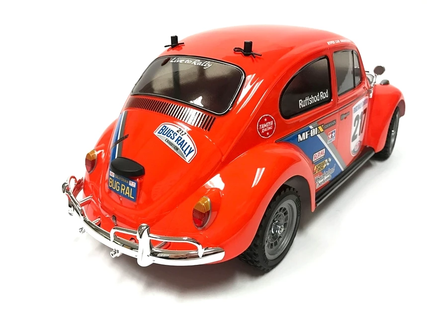 This R/C model assembly kit recreates the classic Volkswagen Beetle in rally racing form. Thanks to its superlative reliability and uncomplicated upkeep, it was a fixture on the global rally circuit from the 1950s through to the 1980s, and this model is inspired by such rallying Beetles. The VW body sits atop Tamiyas proven shaft-driven 4WD MF-01X chassis, which is at home on a range of surfaces from road to flat dirt.