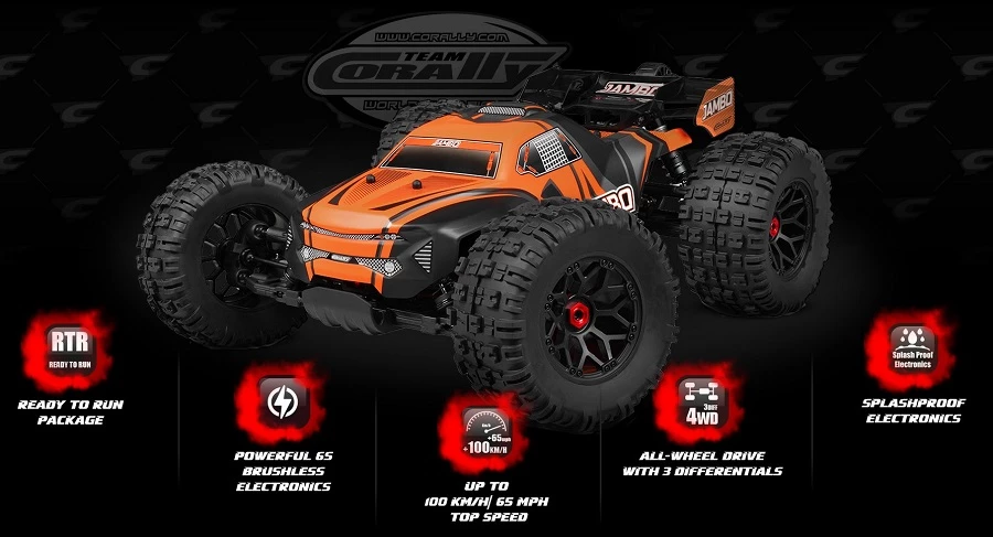 With enough horsepower to pull wheelies on demand, yet maintain control, the Team Corally’s Jambo XP 4WD 1/8 Scale Brushless Stunt Truck RTR is a vehicle with extreme stunt capabilities, yet unsurpassed reliability. Combining a short wheelbase with the capability of 6S LiPo power and a 2050KV brushless motor, you can dominate bash spots, skate parks or local streets.