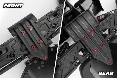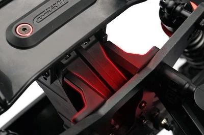 | Extra Large Battery Compartment The Jambo features a huge battery compartment (161 mm x 51 mm) to allow a vast array of different LiPo batteries to be used. Additional convenience is provided by included spacers that deliver the security that only a perfect battery pack fit can provide. The assorted spacers allow quick and easy battery changes-even changing from 4S to 6S is a simple, easy, and convenient. | Heavy-Duty Front and Rear Skid Plates Normally an expensive option part on most vehicles, Team Corally includes as standard on the Jambo strong, durable front and rear skid plates to protect lower arm and gearbox mounting locations. Bash with confidence thanks to Team Corally. |