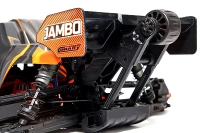 The Jambo XP features a robust pivot ball-style front suspension utilizing steel pivots and steering turnbuckles in addition to tough composite suspension arms. The rear suspension features composite outboard hubs and one-piece composite upper suspension links. At each corner, durable HiCC8 composite suspension arms and threaded, adjustable 16mm big bore oil-filled shock absorbers produce plush, compliant handling.