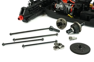 | Bulletproof, Steel Drivetrain with Extra Large Rubber-Sealed Bearings As usually seen only on premium competition-level RC vehicles, the Jambo is fitted with front, center, and rear silicone fluid-filled and sealed limited-slip differentials that ensure the full amount of power from the 2050KV Kuron motor gets to the ground. With easy removal and maintenance, you can even alter each differential individually to fine-tune the amount of traction at either end of the truggy! Inside, you’ll find a complete set of metal gears and outdrive cups that connect to steel central driveshafts. The front end is driven by CVD driveshafts, while the rear is driven by robust metal dogbones, with the entire drivetrain supported by aerospace-quality 8x16x5mm rubber sealed ball bearings for maximum efficiency and durability. | Oversized Composite HiCC8 Parts Plastic components used on the Shogun are manufactured from a Team Corally-proprietary, custom-blended HiCC8 polymer for strength and precision, while the race-engineered, torsionally-optimized design of the parts themselves provide the ideal balance of rigidity, flexibility, and durability. |