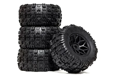 | Heavy-Duty 3mm 7075 Aluminium Steering Plate The Jambo has a precise and direct steering feel thanks to an oversized 3mm thick Ackermann-adjustable steering plate. Made from premium 7075 material for strength, details like these guarantee a quality driving experience! | Multi-Block Stunt Tires The grippy rubber tyres are designed specifically for the Jambo, featuring foam inner liners, and glued on aggressive-looking honeycomb spoke wheels on 17mm hex drive hubs. The aggressive tread pattern in combination with the low-profile sidewall design minimizes ballooning and provides maximum grip for maximum fun and control on all terrain. |