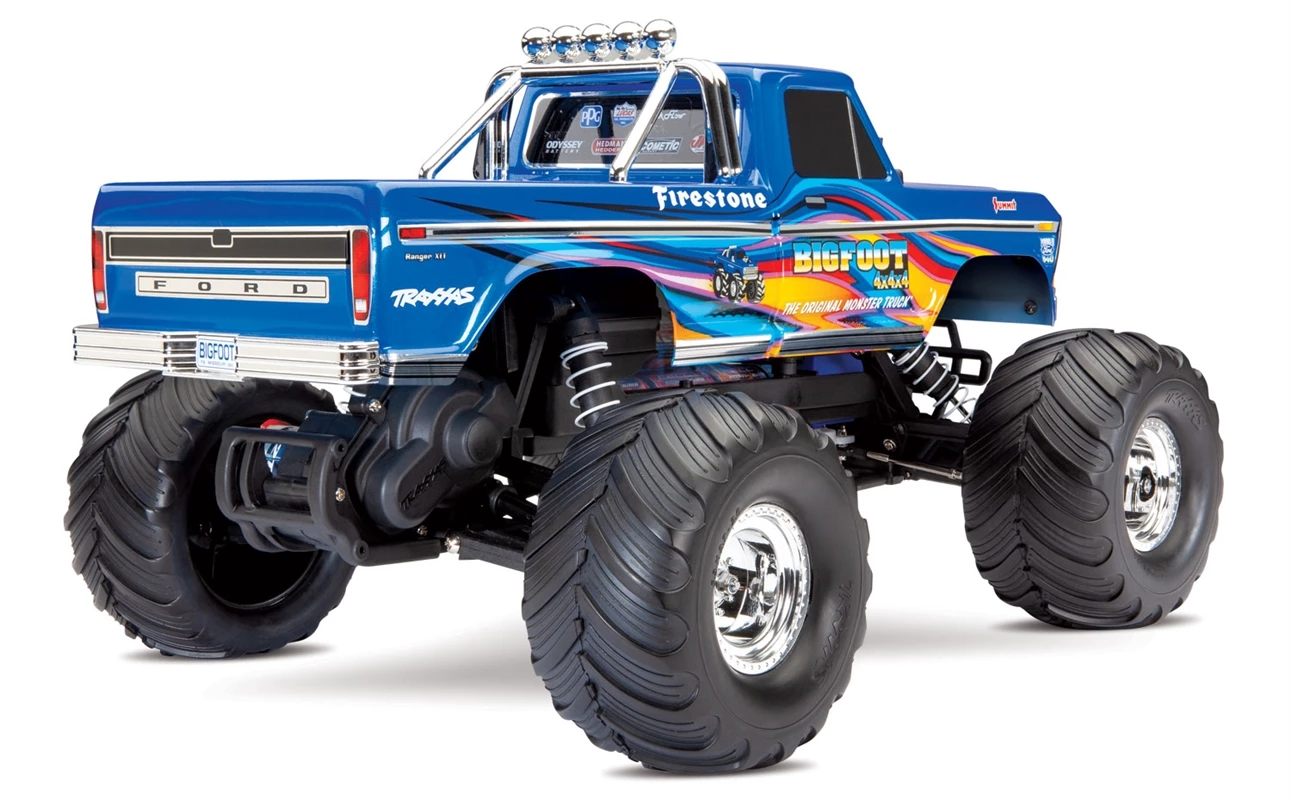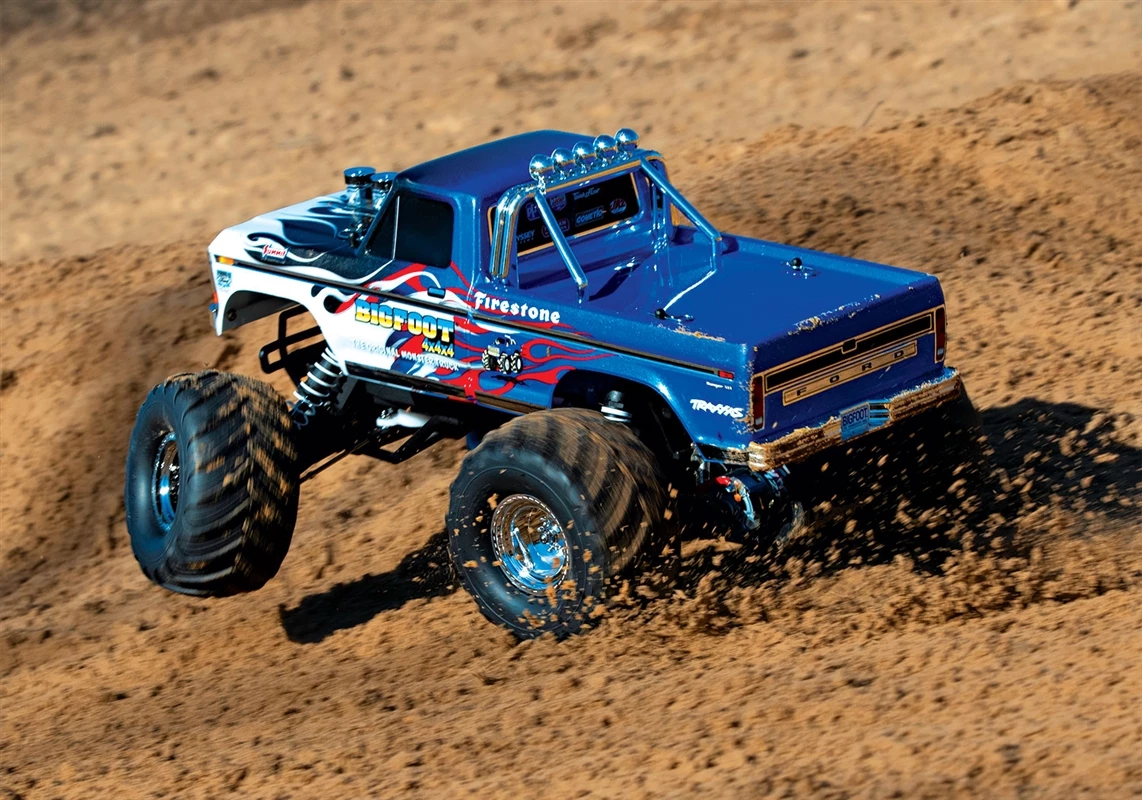 With a truck as legendary as BIGFOOT, Traxxas went all-in to create a replica body worthy of the BIGFOOT name. BIGFOOT wouldnt be the same without thousands of stadium lights gleaming off its miles of chrome. From the molded chrome bumpers to the KC lights on top of the chrome roll bar, BIGFOOT commands attention. The highly detailed molded chrome grill stands ready to feed the massive big block engine with its impressive high rise dual-carb manifold. The brilliant blue metallic paint of the officially licensed F-100 Ford XLT Ranger body and authentic BIGFOOT No. 1 decals recapture the excitement of The Original Monster Truck. This is the BIGFOOT from Traxxas. One look and you know it means business!