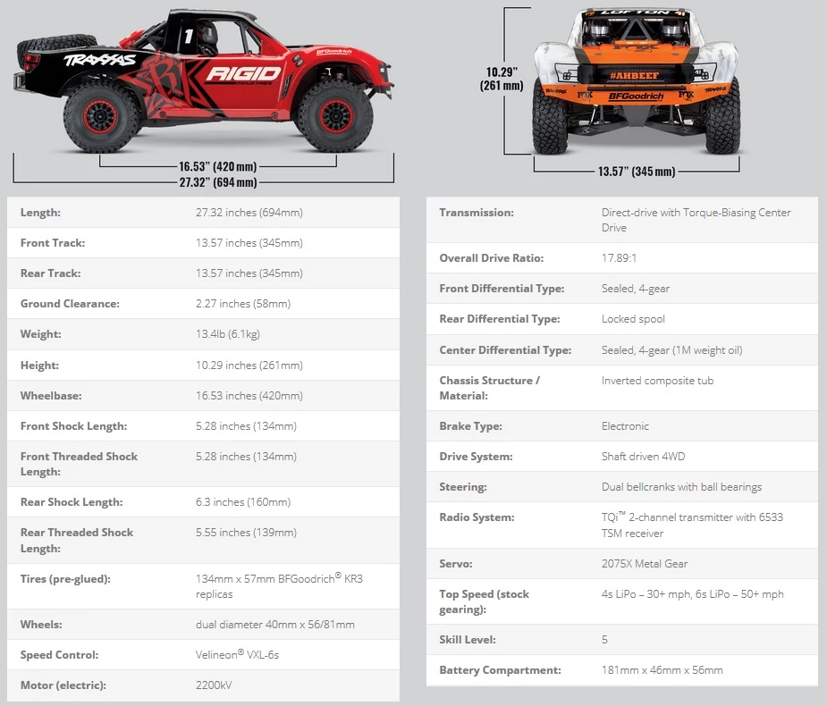 The 50+ mph Unlimited Desert Racer delivers its pro-level performance with brutal 6s power. The VXL-6s ESC combines massive power handling with high-tech telemetry features. An ultra-tough drivetrain harnesses the extreme power to make it easy to control and fun to drive.