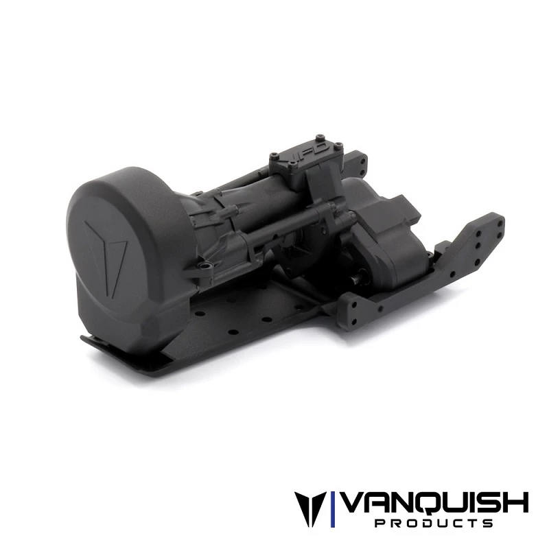 The VFD Spec Transmission from Vanquish Products is designed to provide an optimal balance of performance, scale appearance, strength and versatile optional accessories. The VFDs design places the motor forward and as low as possible to keep the weight where you want it. The VFDs combination of offset front T-case output and offset pumpkin of the Currie front axle make this possible. The T-case utilizes unique bearing plates for high strength bearing positioning and the elimination of flex found in traditional housings. The modular design of the bearing plates allow for optional gear ratios to be used inside the T-case.