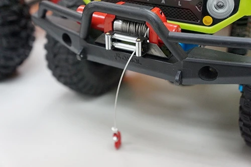This winch offers ultra scale looks, superior quality and craftsmanship. It winds up or out of the wire cable, allowing you to tow objects or another off-road car stuck in the mud.